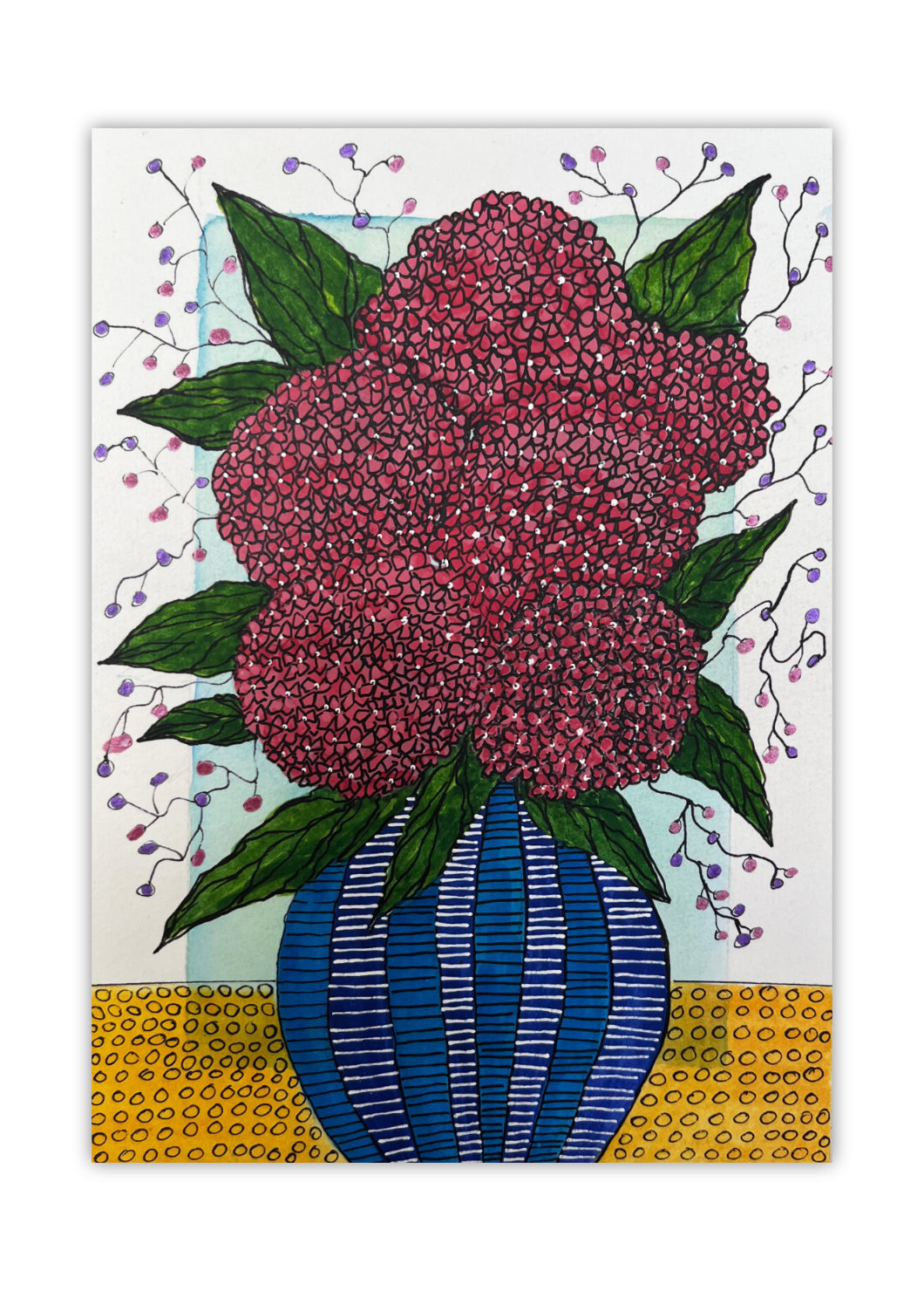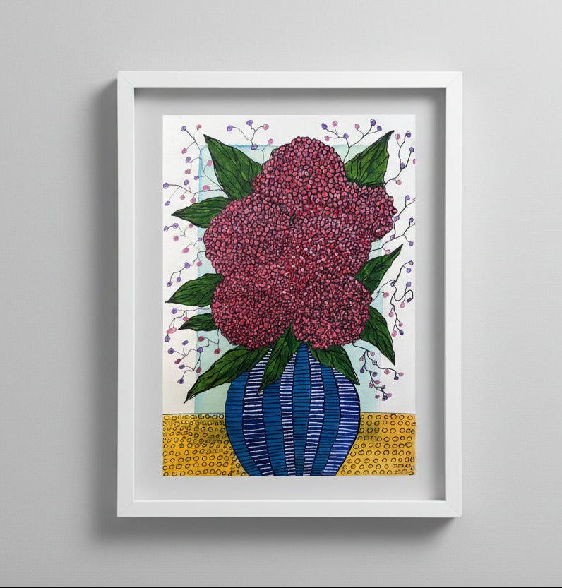 A vibrant arrangement of purple and red hydrangeas in a blue and white striped vase. This unique, hand-painted watercolour artwork features intricate line work and a stylised, patterned background.