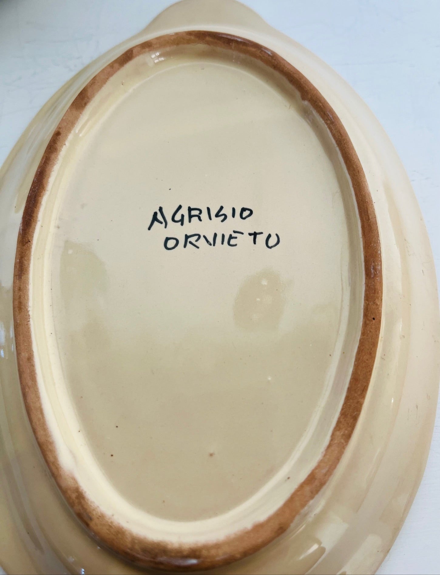 These pieces are from Orvieto, a town in Italy with a long tradition of ceramic production, particularly known for its medieval majolica ware. The name Agrisio, indicates the maker or artist.