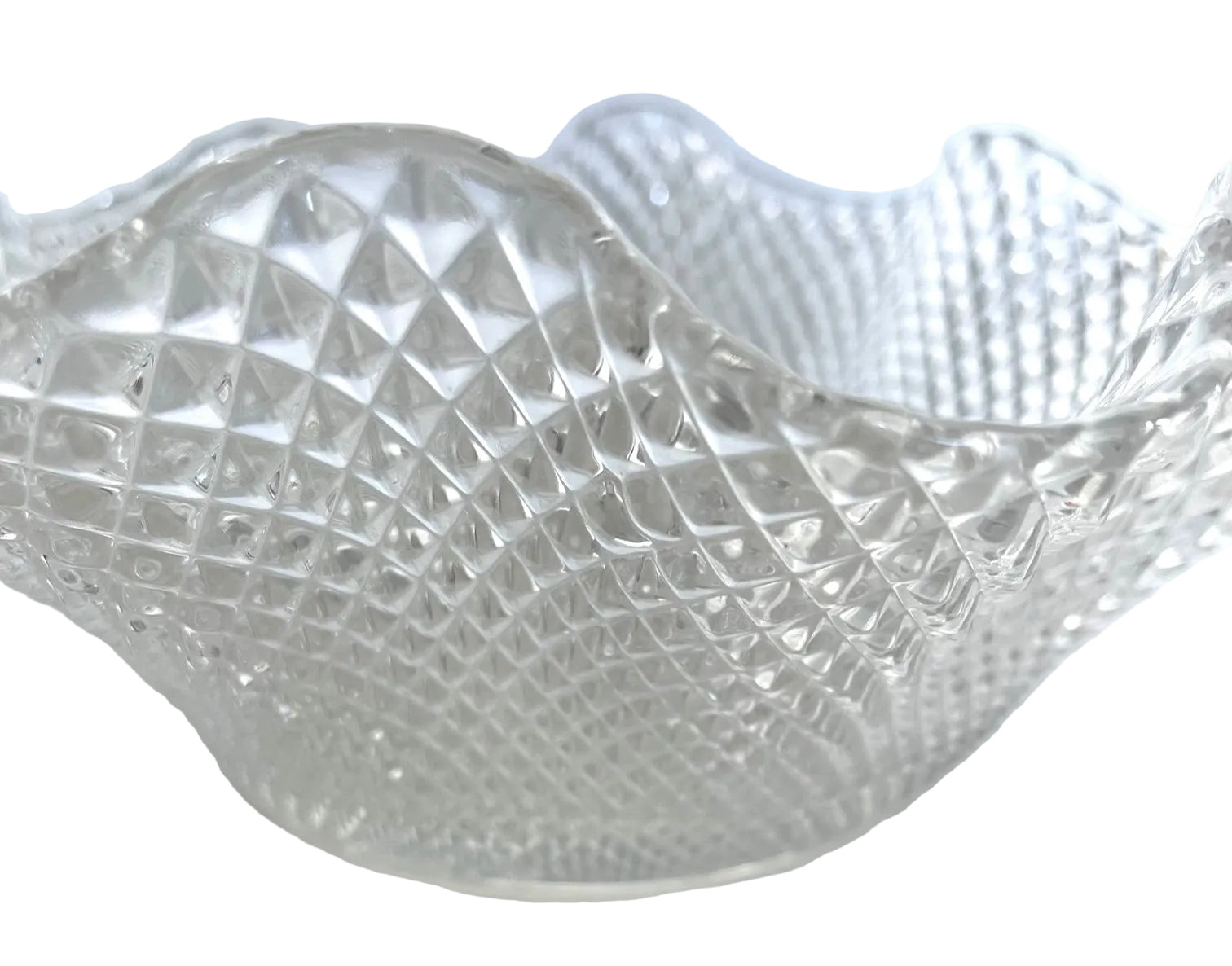 Japanese Kamai crystal serving bowl from the 1940s, distinguished by its geometric diamond point pattern and delicately ruffled edges. This vintage piece exemplifies mid-century Japanese glasswork craftsmanship, featuring the clarity and refined aesthetic characteristic of Kamai's production. The textured surface catches light beautifully, making it equally suited for display or entertaining. A striking addition to collections of vintage glassware and Japanese decorative arts.