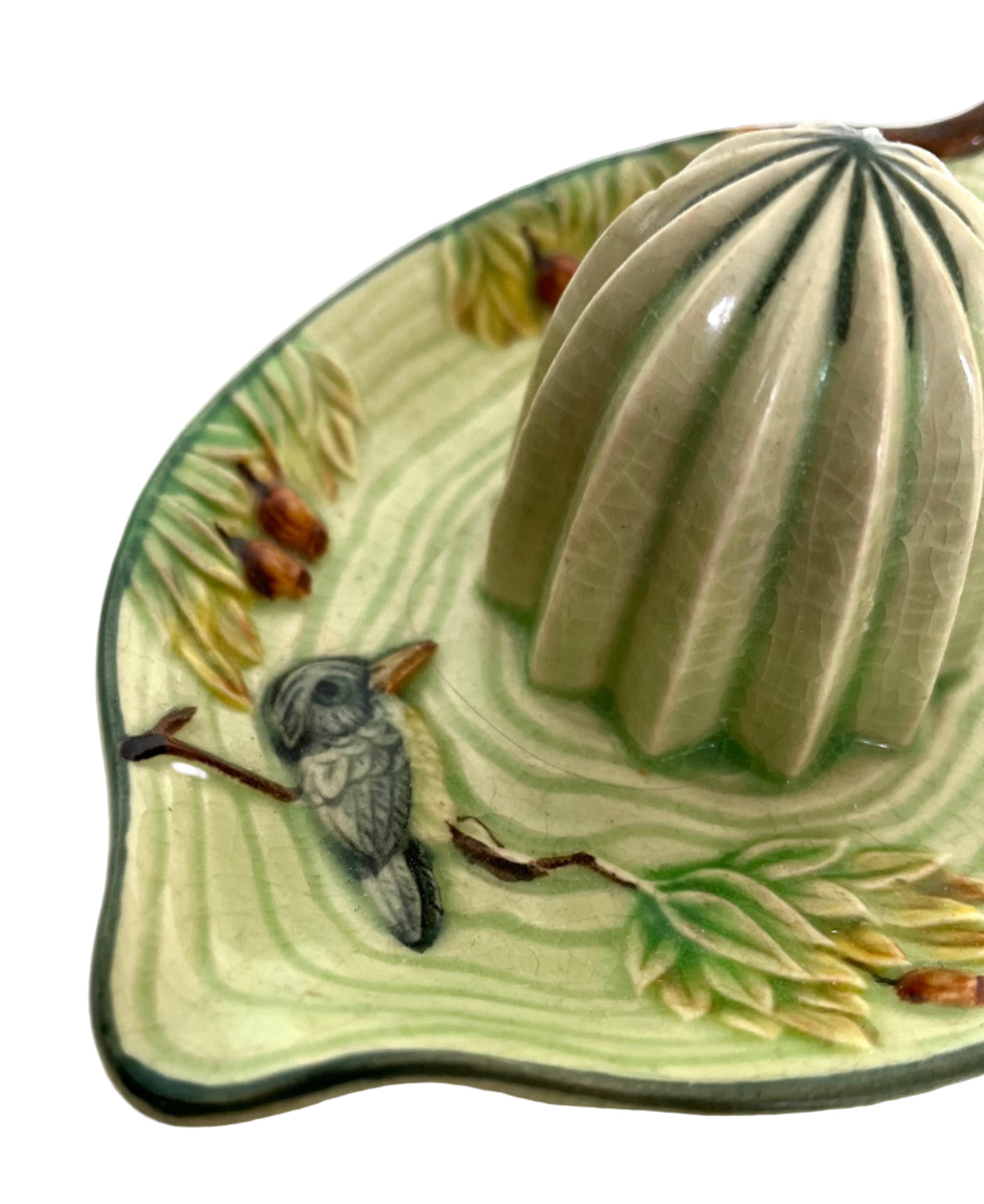 Hand-painted with a pale green glaze and brown and green details.
