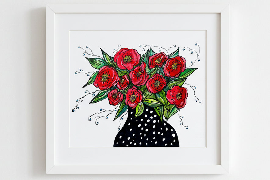This exquisite watercolour artwork captures a sophisticated floral arrangement featuring vibrant poppies and roses nestled among lush green foliage and delicate blue berries. The composition is presented in a striking black and white spotted vase that anchors the piece with timeless elegance.