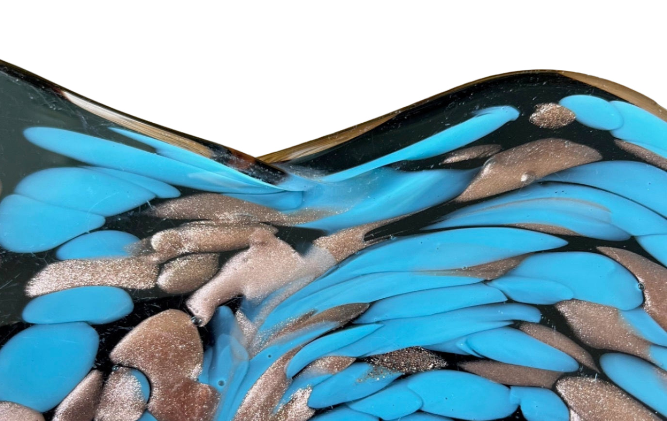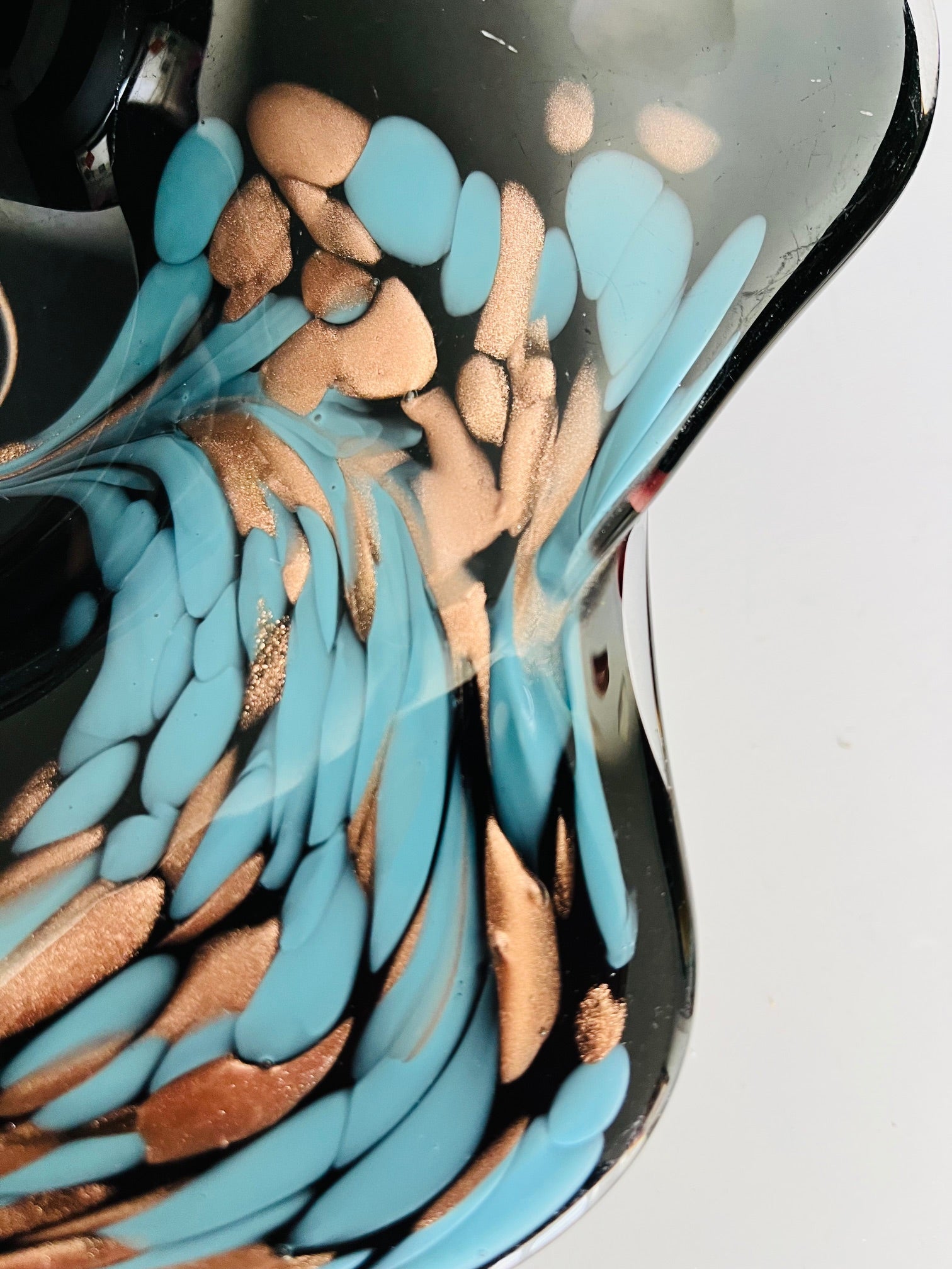 this breathtaking 1950s glass centrepiece features the famed 'Starry Night" motif done in glittering swirls of copper, blue and grey aventurine floating on a black background.