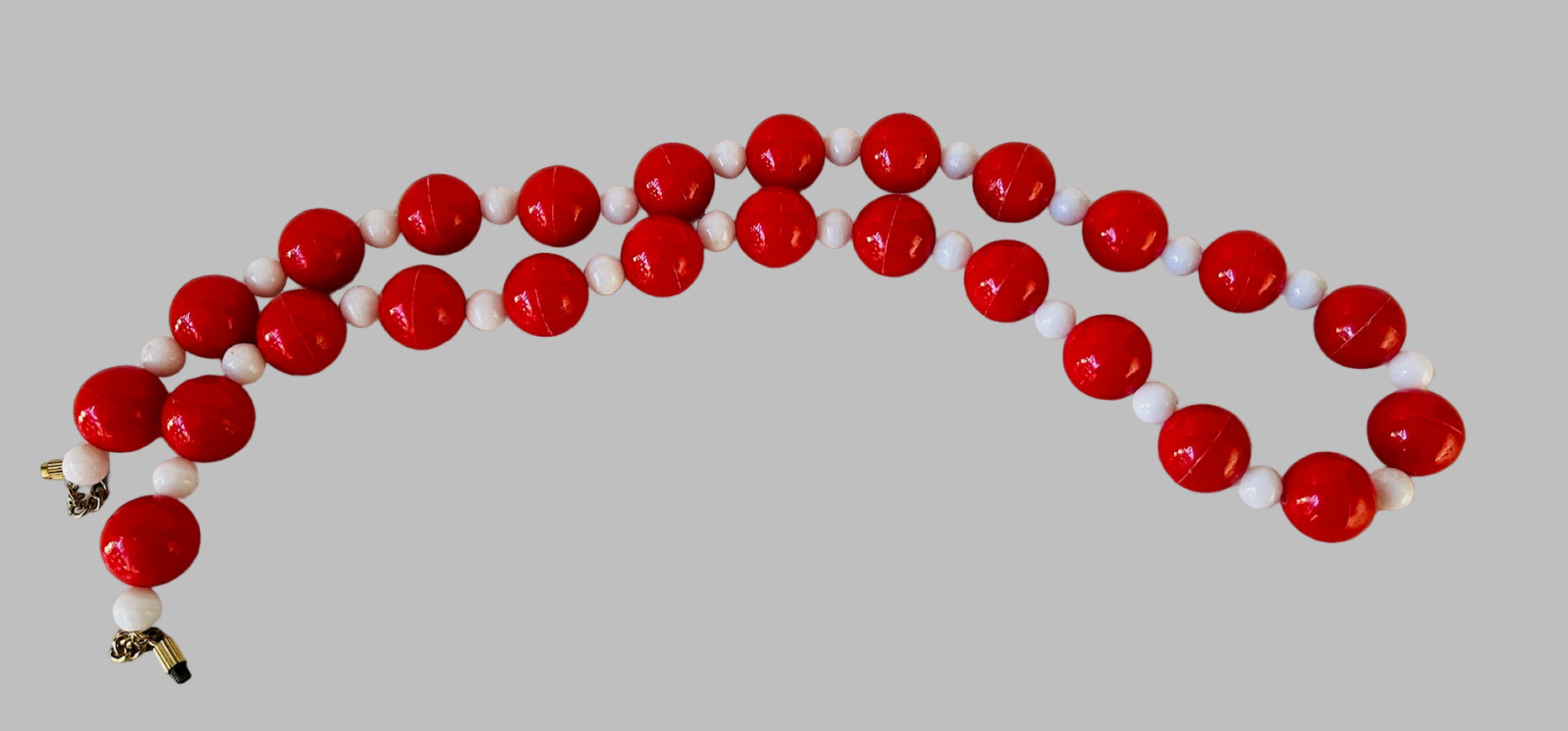 This gorgeous necklace features round orange beads and are separated by white beads.