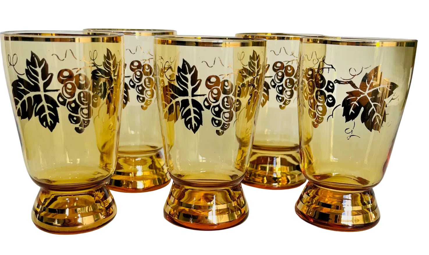 Five gorgeous vintage amber glass shot glasses with a gold grape and leaf pattern.
