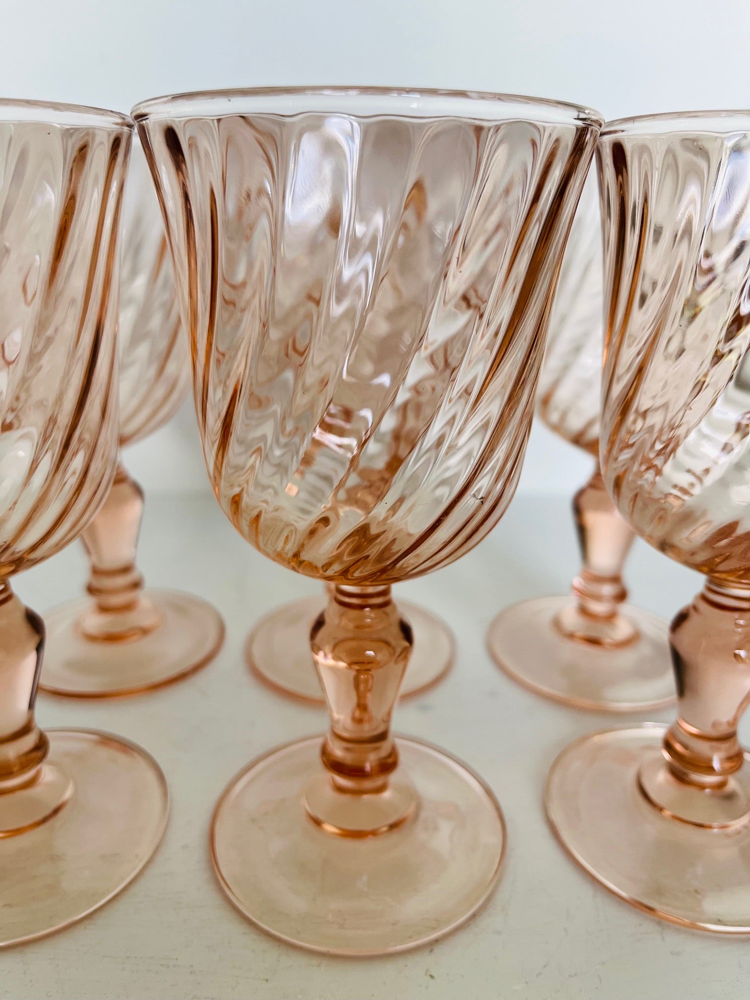 Set of six French vintage Luminarc wine glasses in Rosaline blush pink with distinctive swirl detailing. Each 125ml glass showcases the elegant glassware craftsmanship characteristic of 1970s French design.