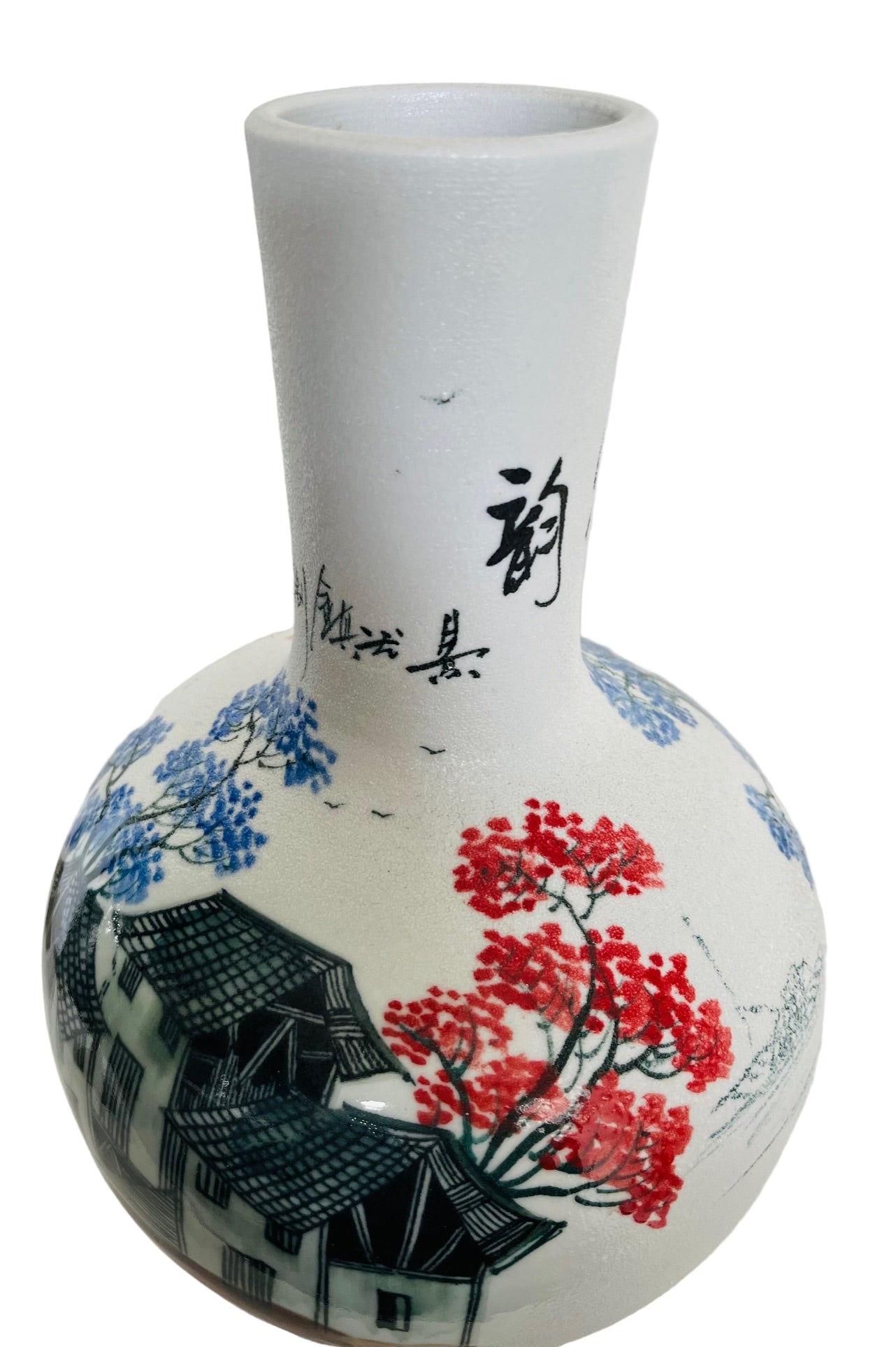 Featuring a beautifully hand-painted village and mountain landscape in vivid hues of red, green and blue, this piece reflects the peaceful charm of rural China. Delicate brushwork and subtle calligraphy wrap around the vase, capturing the feeling of nostalgia and harmony with nature.